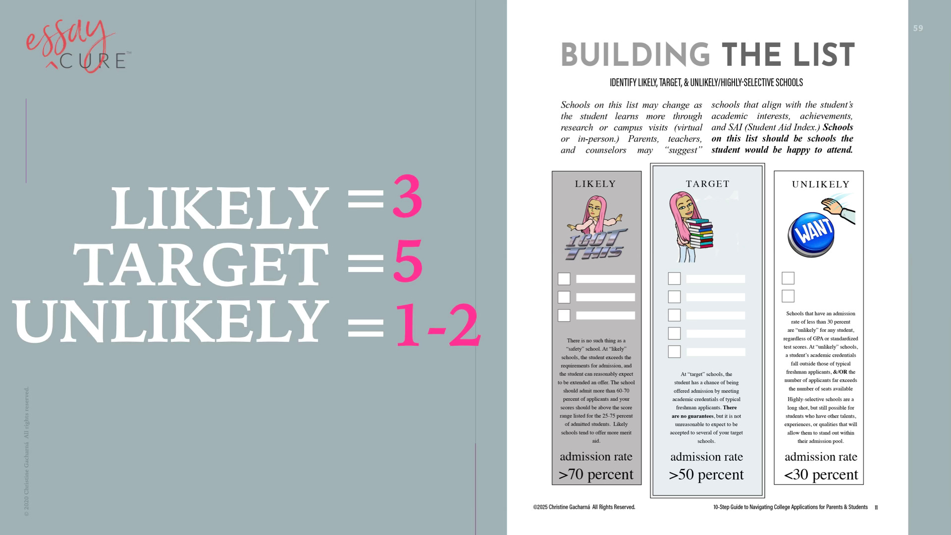 Students should aim to build a diversified list of schools to apply to that includes three likely, five target, and one (maybe two, depending on the student) unlikely schools.