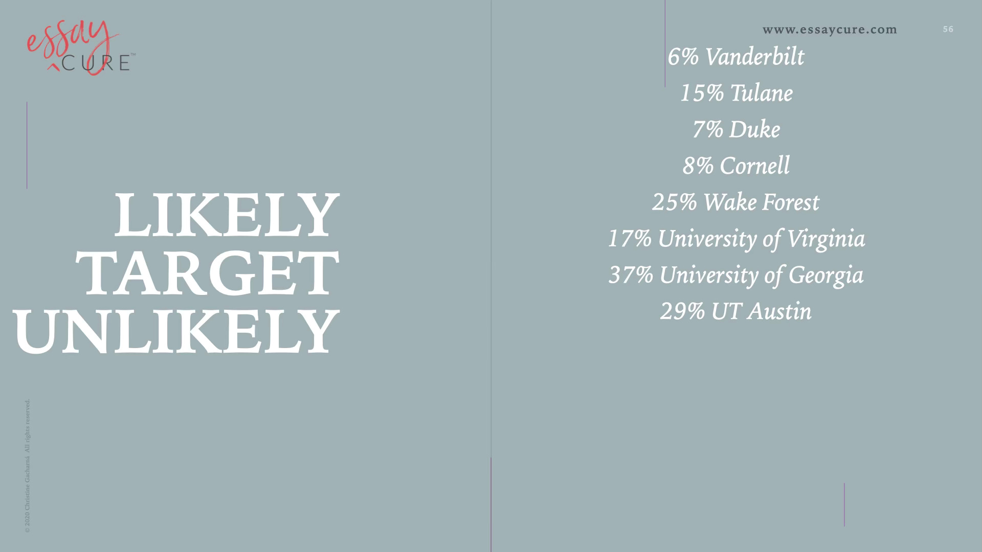 IECs guide parents and students in a reality-based evaluation; there’s no such thing as a safety school, and many of these schools were highly unlikely just based on the numbers alone.