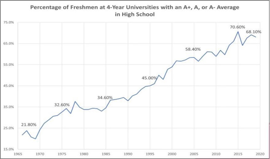 Grade inflation is definitely a thing. Somewhere in the middle of this chart is when I was applying to college, and the percentage of students who had 4.0s was about 34 percent. Now, it hovers between 68 and 70 percent. Think about it: your great student has a 4.0 average, but so do 70 percent of applicants.