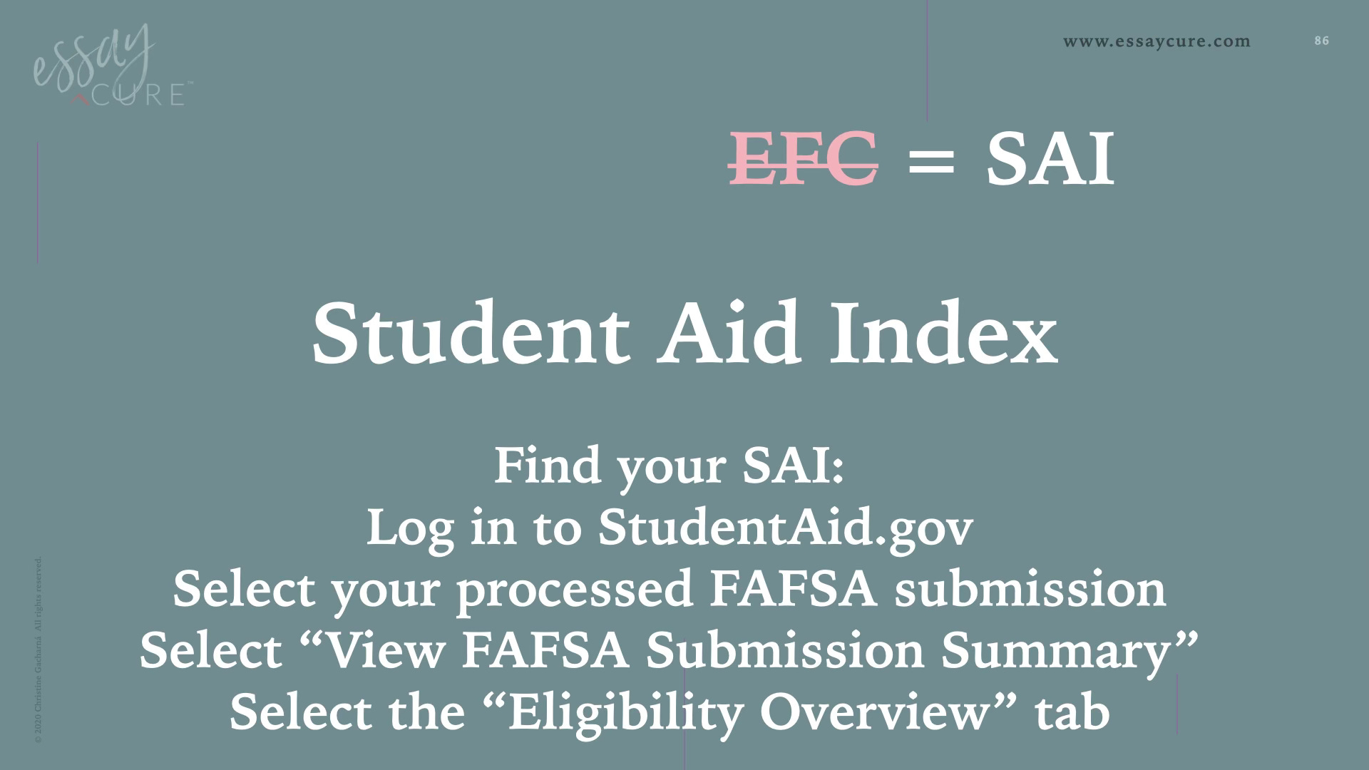 The federal government has since changed the wording to “Student Aid Index” or SAI, which I think softens the blow for parents (making parents less outraged at the government, although it doesn’t do much to soften the blow for shouldering the costs of higher education.)