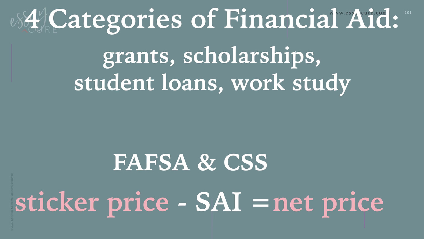There are four categories of financial aid: grants, scholarships, student loans, and work study.