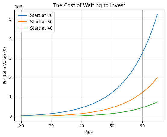 Someone who begins investing at 20 can end up with millions more dollars than someone who begins at 30 or 40.