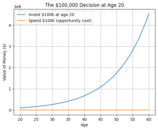 If $100,000 is invested at age 20 and earns an average 10% annual return, it could grow to more than $4 million by age 60. This illustrates the opportunity cost of large financial decisions early in life.